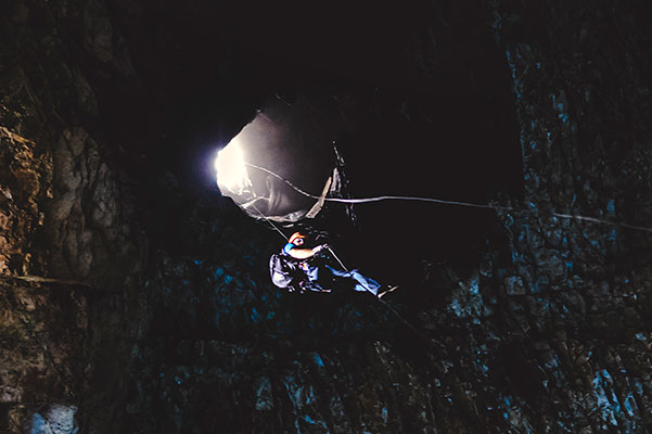 Un deuxième puits aveugle de 87 mètres de dénivelé et 5 mètres de diamètre plonge depuis le fond de la salle vers des profondeurs invisibles.